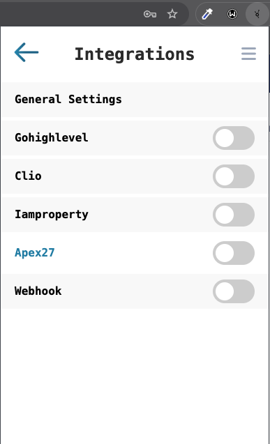 • Click on Top Right Menu -> Integrations -> Apex27