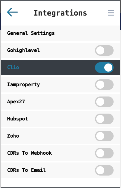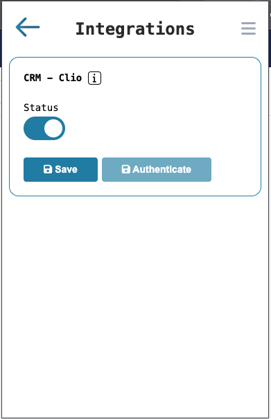 Note: Only Admin User can access these Integration Settings. All other users can see active CRM Settings and all users can authenticate their own user account.