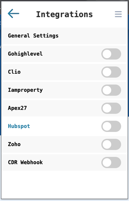 • Click on Top Right Menu -> Integrations -> Hubspot