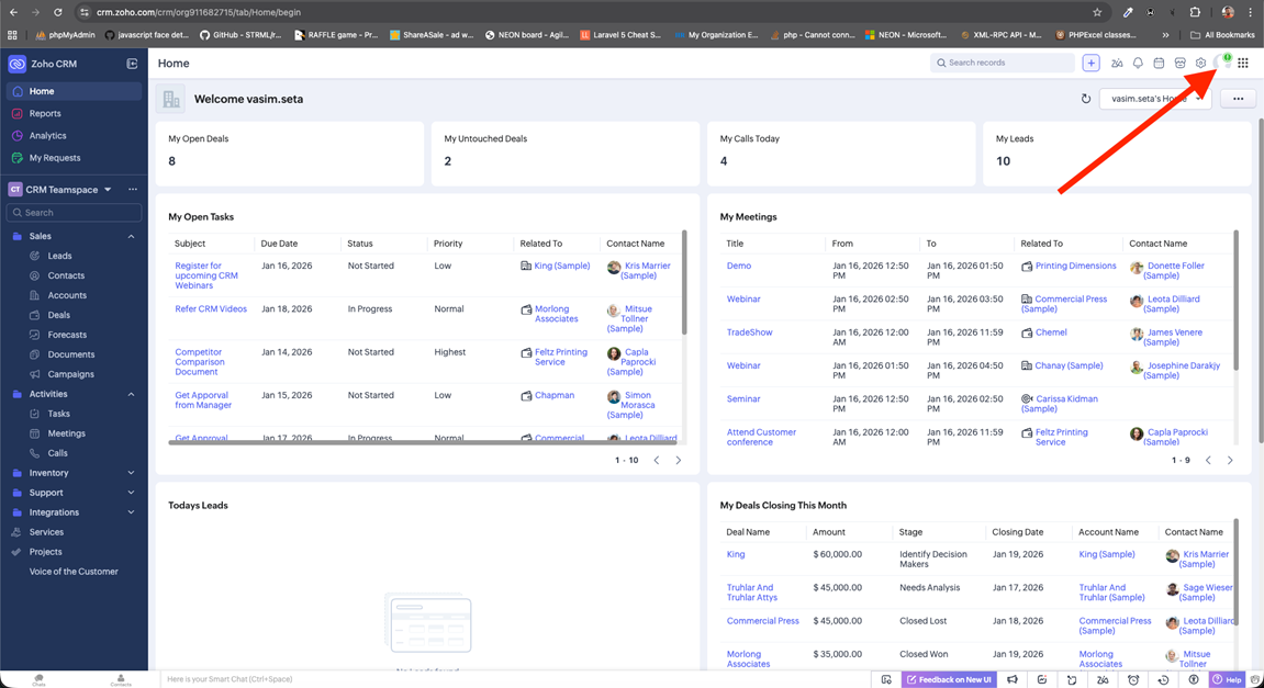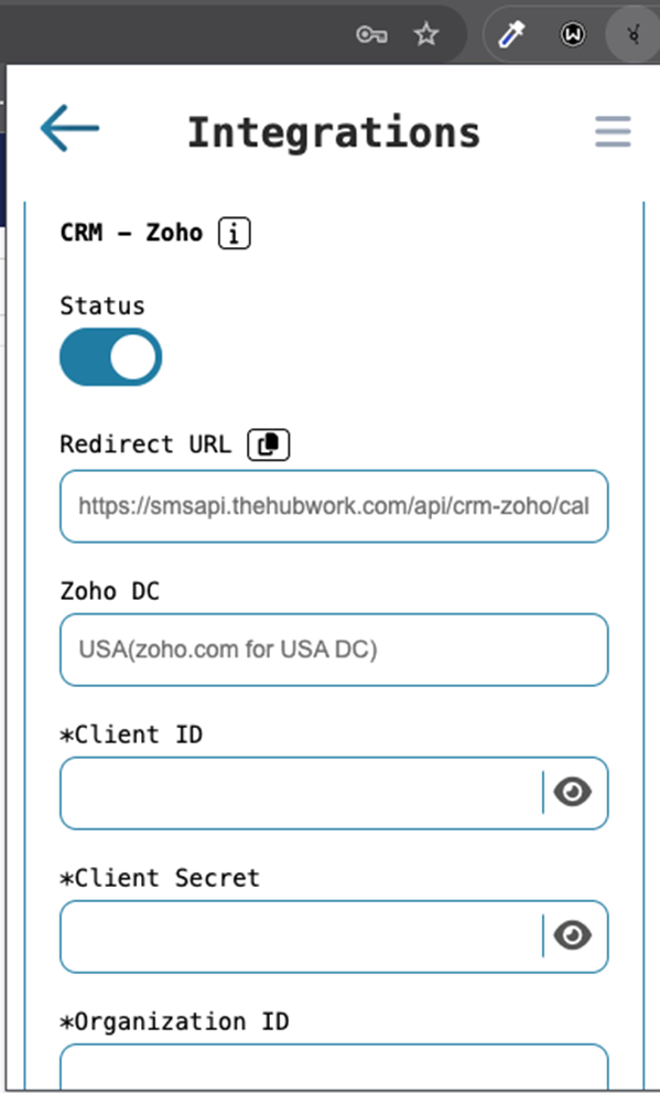 • Turn On “CRM - Zoho” -> Status -> Turn this setting on to use CRM:Zoho