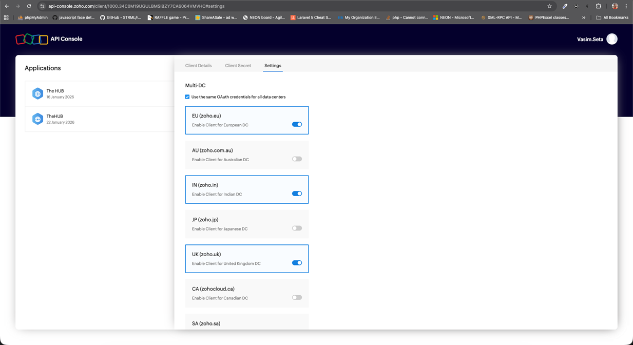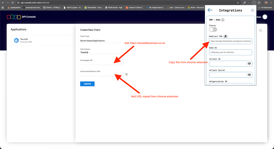 • Copy CLIENT ID and CLIENT SECRET from here and add it to chrome extension -> Menu -> Integrations -> Zoho -> client id & client secret